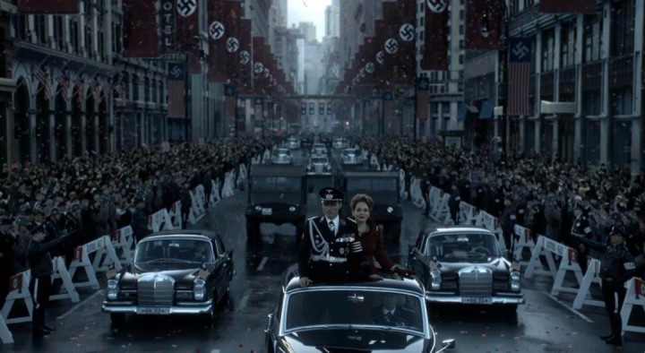纽约街头飘扬的纳粹旗帜、旧金山街头走动的日本军人,英语里夹杂着德日腔调,美国家家户户挂起希特勒像……